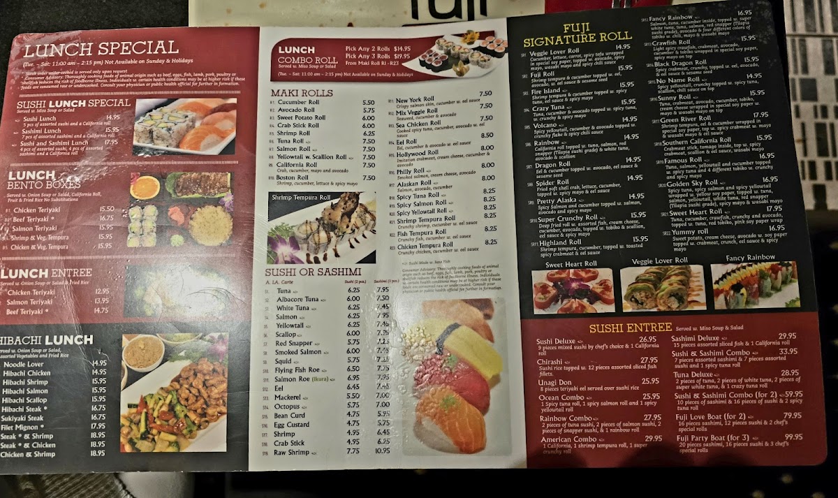 Welcome to Fuji Sushi & Steakhouse, where culinary artistry meets an electrifying atmosphere. Located in Waite Park, MN, this Asian-inspired haven brings together the best of Japanese cuisine with a touch of showmanship. The menu is a masterclass in variety, offering delectable sushi rolls and mouth-watering hibachi specials. Customers can indulge in a lunchtime combo roll, where they can tailor their experience by choosing from a range of flavors.
